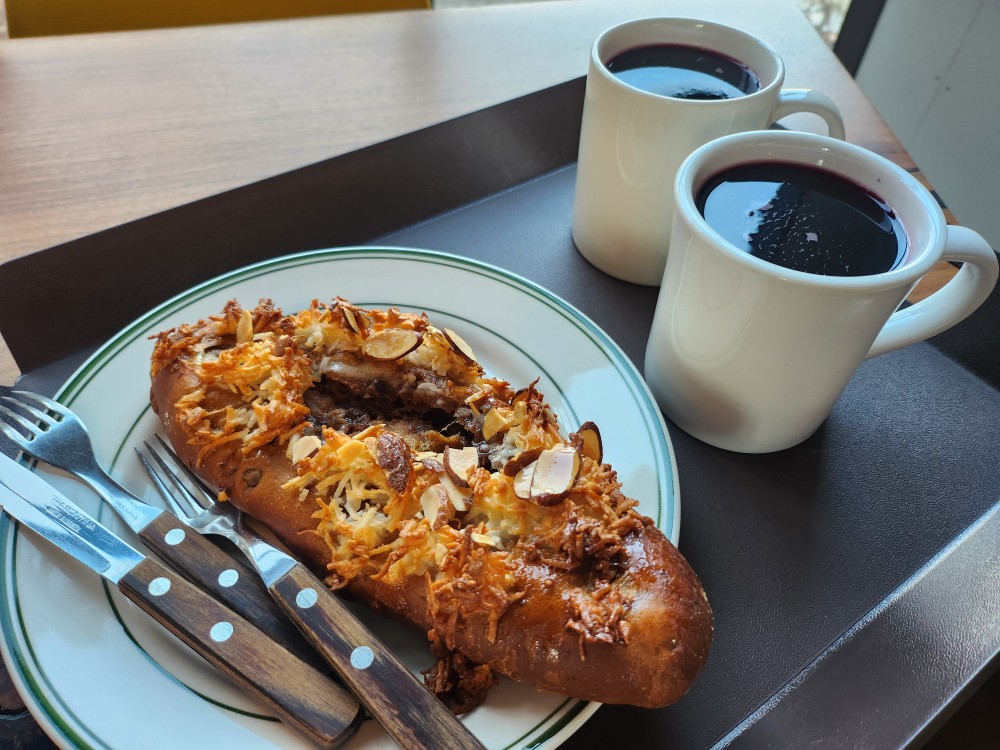 오늘 우리가 주문한 메뉴는 따뜻한 뱅쇼와 맛있는 빵~  아쉽게도 빵 이름을 잊었는데요, 찹쌀과 코코넛과 모카가 잘 어우러진 너무 맛있는 빵이였어요.   아쉽게도 커피를 마셔보지 못했지만, 왠지 커피도 너무 맛있을것 같아요.